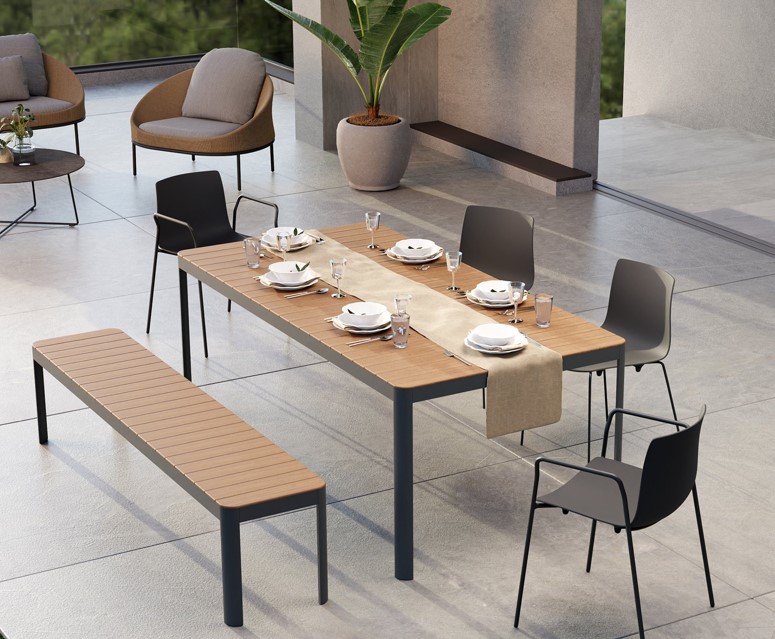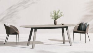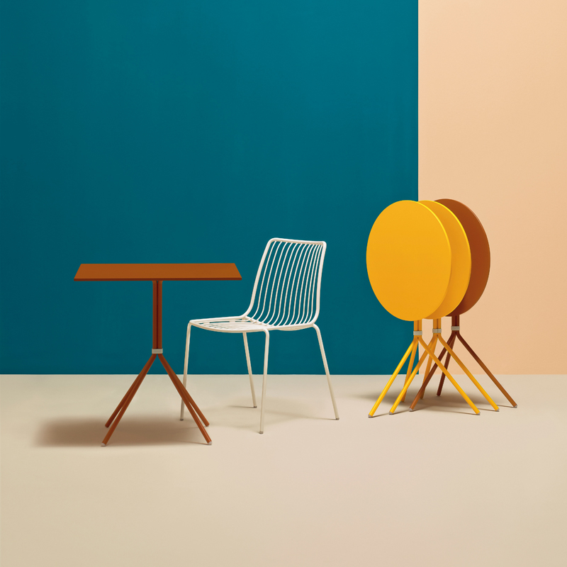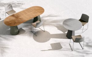 שולחן אוכל עגול או מרובע מבית המותג B&T, מתאים לאזורי הסעדה וכן לאזורים חיצוניים. המשטח זמין בגימורים משתנים במבחר צבעים. הסדרה כוללת שולחן קפה.