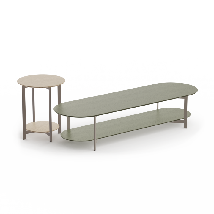 סדרת שולחנות קפה וצד מבית המותג B&T, אידיאלי לאזורי לאונג', סביבות אירוח והמתנה. לפריטי הסדרה רגלי מתכת בצבעים שונים ומשטח עליון ותחתון בגימורים משתנים. השולחנות מגיעים במספר גדלים בצורת אליפסה או עיגול.